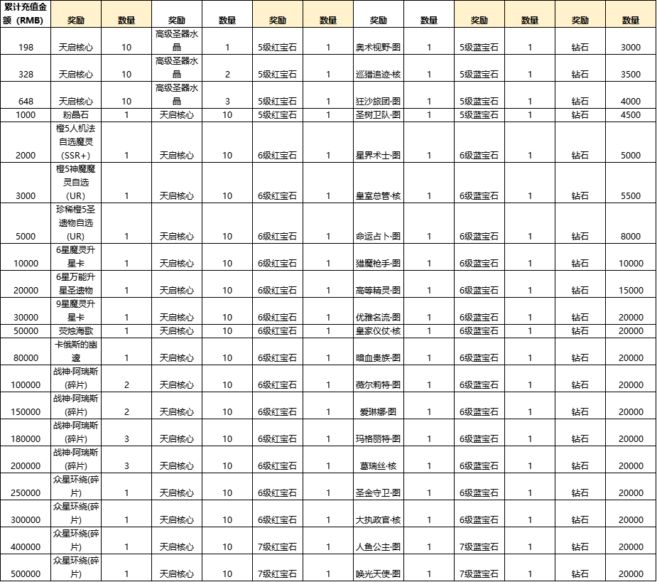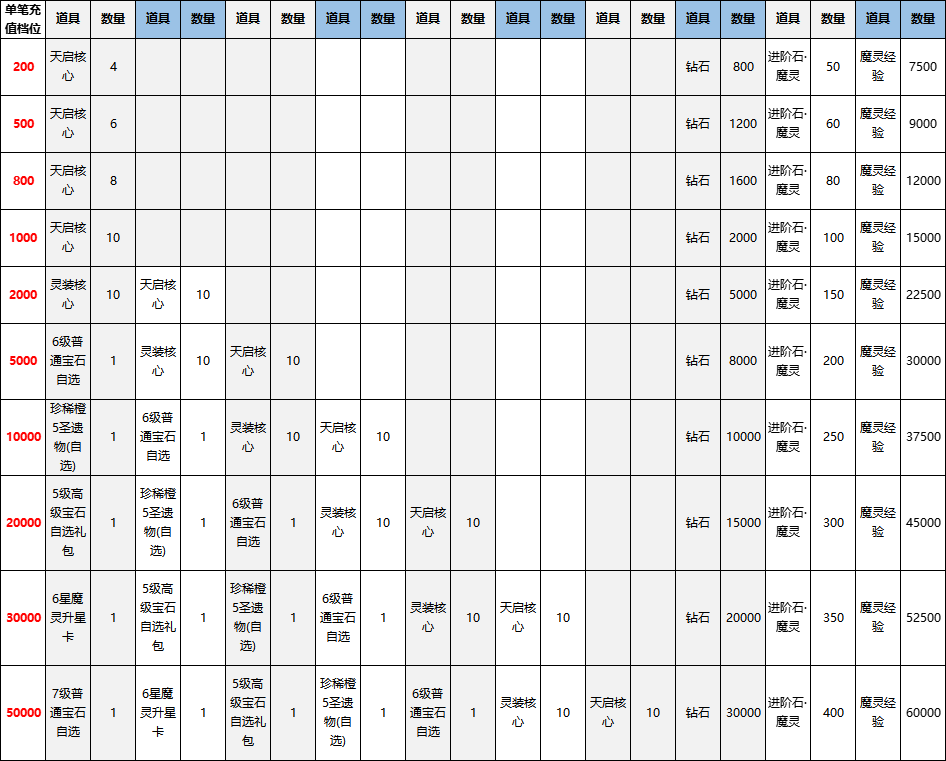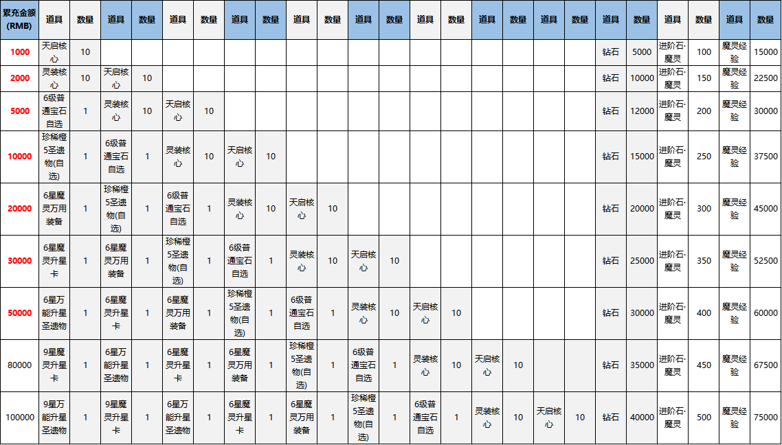 参与方式:活动期间,玩家充值累计达到指定金额,可获得该档位达到的最高档的奖励,可选择任意一个符合要求的礼包类型进行发放